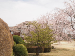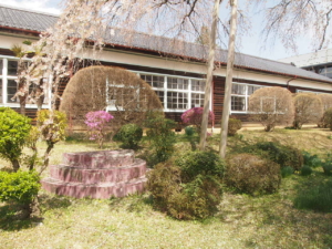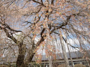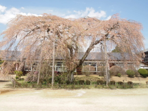 雨情枝垂れ桜が校庭の南側にございますが
