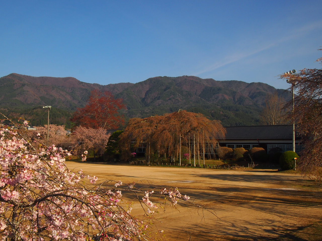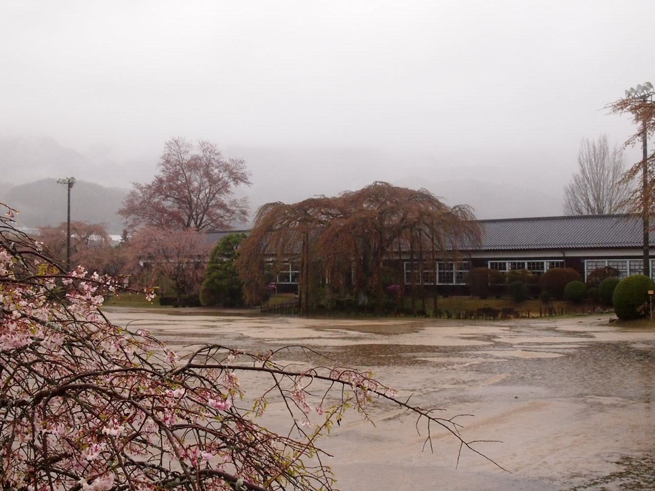 雨情枝垂れ桜が校庭の南側にございますが